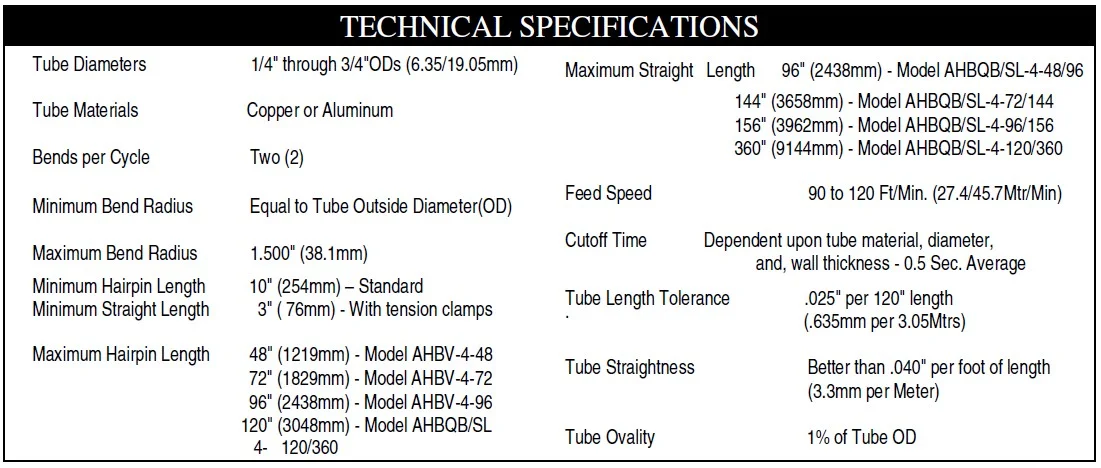 The Model AHBBQ/SL Qual-Ekon Hairpin Bender/Straightener is a fully automatic machine that will either bend 180 degree hairpin bends or feed, straighten and cut to length copper or aluminum tubes from level wound rolls. This machine processes two tubes pre cycle and uses a hitch type feed system with a chip free orbital cutoff.