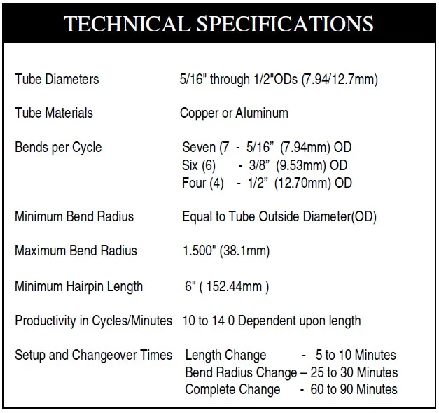 The production application of the TRIDAN Model AHBS-1 is to produce hairpin bends from short pre-cut straight tube lengths of copper or aluminum having outside diameters between 5/16"(7.94mm) and 1/2"(12.7mm). The AHBS-1 bends seven (7) hairpins per cycle on 5/16"(7.94mm) OD tubing, six(6) per cycle on 3/8"(9.525mm)OD, and four(4) per cycle on 1/2"(12.7mm) OD. It is a fully integrated system consisting of a Hopper Feed Unit and Hairpin Bender. The Control System is designed in such a manner that all operations are sequenced fully automatically or may be individually placed under manual control. The Hopper Feed Unit is designed to meter and feed the required number of tube lengths to the Model AHBS-1 Hairpin Bender, which forms the hairpin bends, and ejects the completed hairpins. The bender and hopper are integrated together, and mounted on a machined base plate, which also serves as the top of the weldment-constructed hydraulic reservoir. This over-sized reservoir is an integral part of the machine's frame, and is furnished as standard with a liquid level gauge and thermometer.