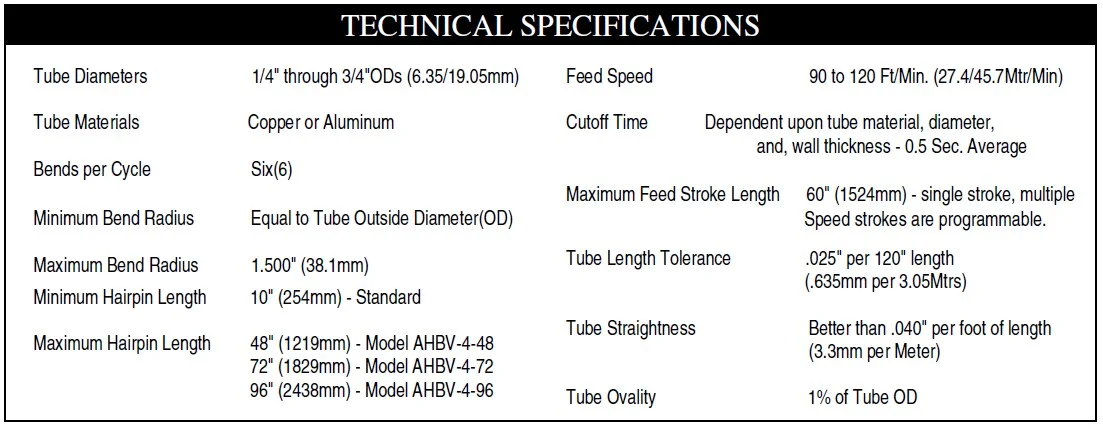 The production application of the TRIDAN Model AHBV-4 is to produce hairpin bends from level-wound coiled tubing of copper or aluminum. It is a fully integrated system consisting of a Tube Straightening, Sizing, and Lubrication Section, adjustable-length Tube Feeding Section, a chipless Tube Cutoff Section, and Hairpin Bender Section. Supporting equipment include a Tube Decoiling System. The Control System is designed in such a manner that all operations are sequenced fully automatically or may be individually placed under manual control.