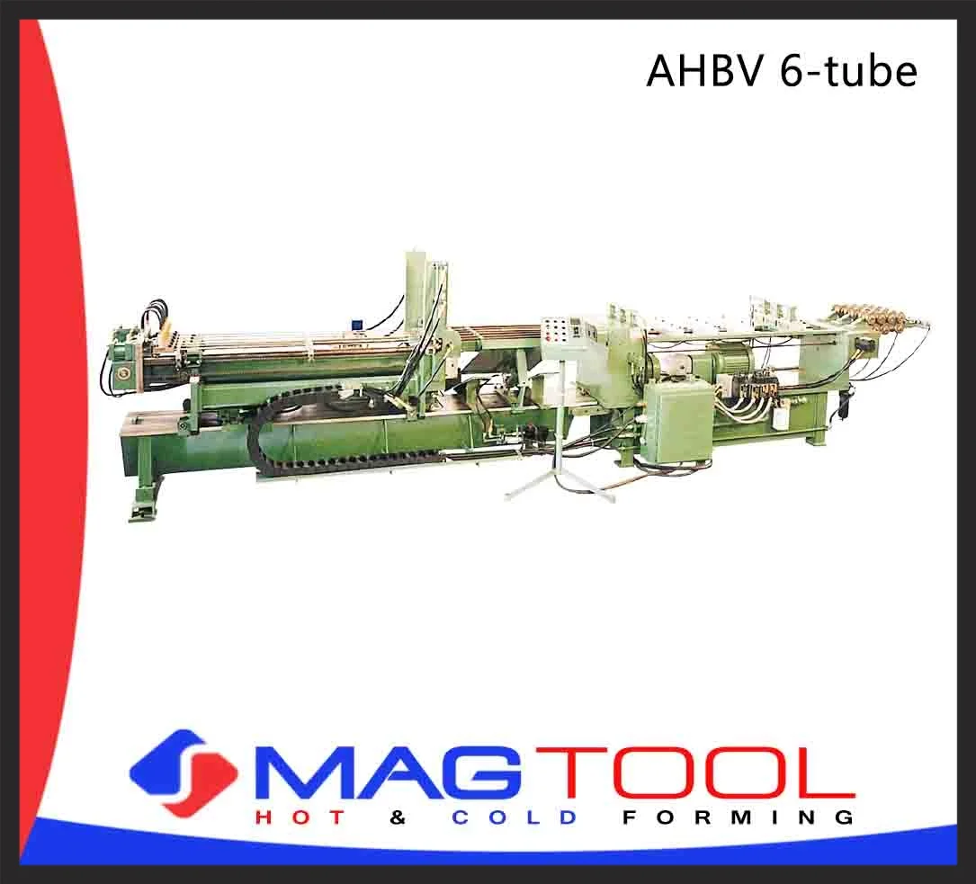 The Tridan Model AHBV- 6 Tube Volutron Hairpin Bender automatically processes six bends 180 degree hairpin bends per cycle. The tubes are hitch fed and cut by means of a chip free Orbital cutting system. The tube that is processed in this bender is supplied from level wound reels and can be either copper or aluminum.
