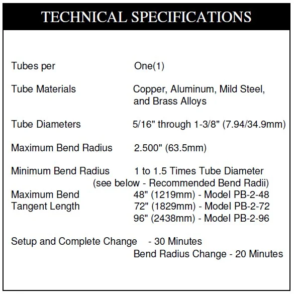 The TRIDAN Model PB-2 Powered Tube Bender is a heavy-duty tube bender with all its tube bending functions hydraulically powered. It is designed for copper, aluminum, mild steel, and brass alloy tubing having outside diameters' between 5/16" (7.94mm) and 1-3/8"(34.9mm). The PB-2 bends one tube per cycle and is capable of producing multiple bends in the same tube with a minimum tangent length between successive bends.