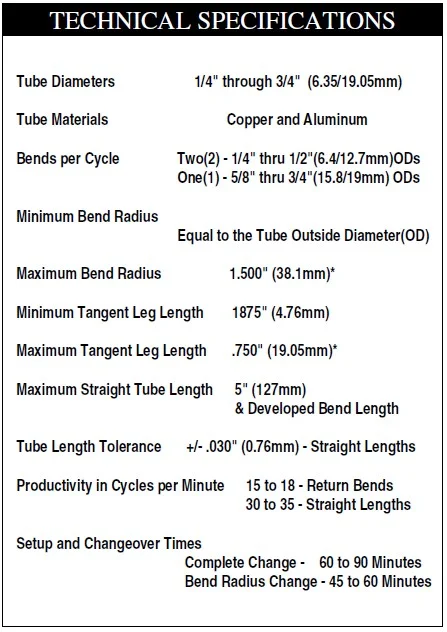 The production application of the TRIDAN Model RBQ-5 is to fabricate short 180 degree bends, known as return bends, "J" Bends (a 180 degree bend with two different leg lengths) elbow bends or short straight lengths directly from level-wound coiled tubing of copper or aluminum having outside tube diameters between 1/4" (6.35mm) and 3/4" (19.05mm). Random straight length of tubing may also be employed; however, the productive output will be reduced and between 12" and 16" (305/406mm) of tubing will be wasted per straight length. It is a fully integrated system consisting of an adjustable-length Tube Feeding and Straightening Section, Tube Bending Section, and Cutoff/Bend Ejection Section. Supporting equipment includes a Tube Decoiling System. The Control System is designed in such a manner that all operations are sequenced Fully automatically or may be individually placed under manual control.