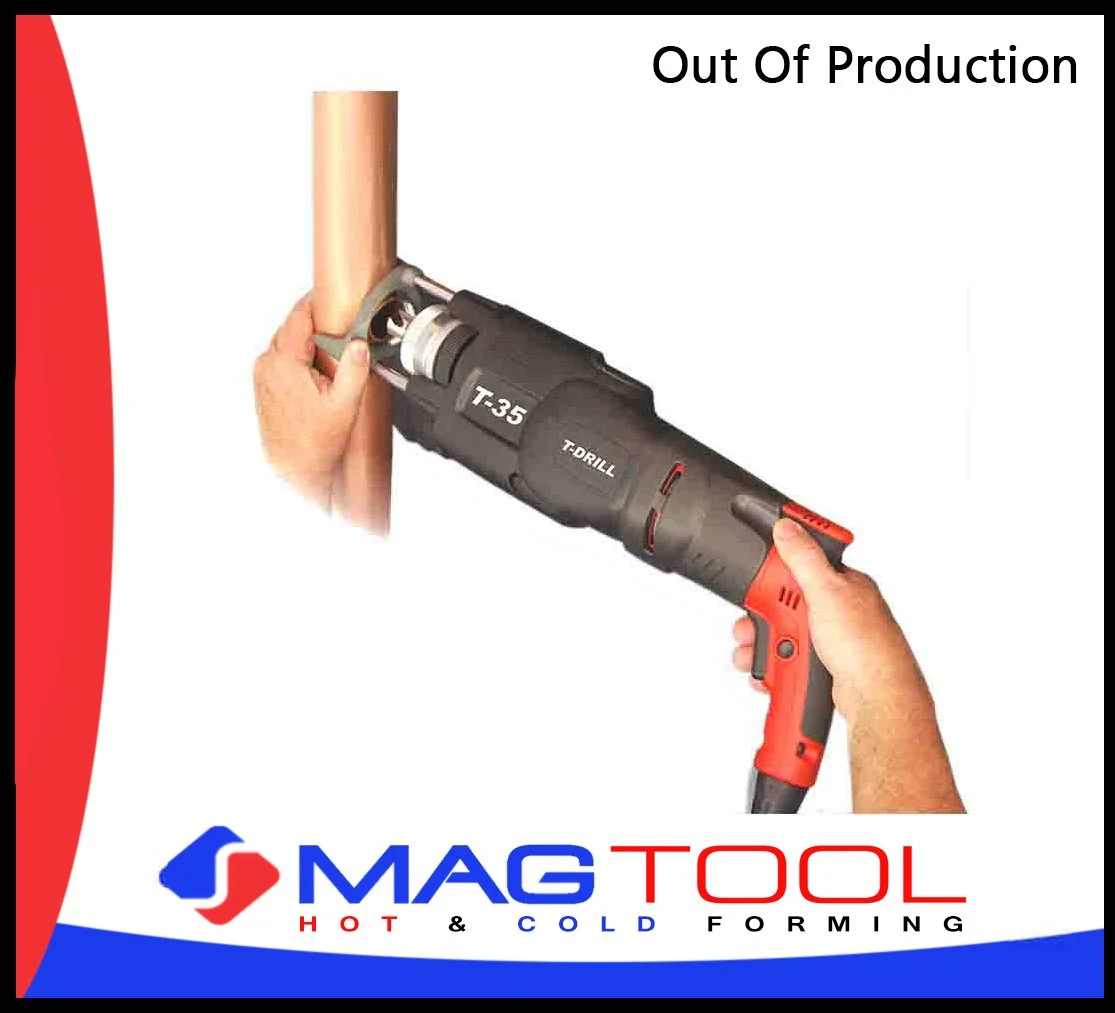 Tee Forming Machines have been perfected by T-Drill who has been manufacturing these invaluable tools since 1969 and has been represented in Canada since 1982, by MAG Tool. The T-35, T-65, T-65-SS and T-65 battery operated hand held T-Drills are capable of producing 1/2” - 2“ branch outlets in up to 6” Copper and Stainless run tube, ( wall thickness dependent ). The Plus 100 extends the T-Drills capacity to a maximum of 4” branches out of 8” run tube in Copper and Stainless Steel